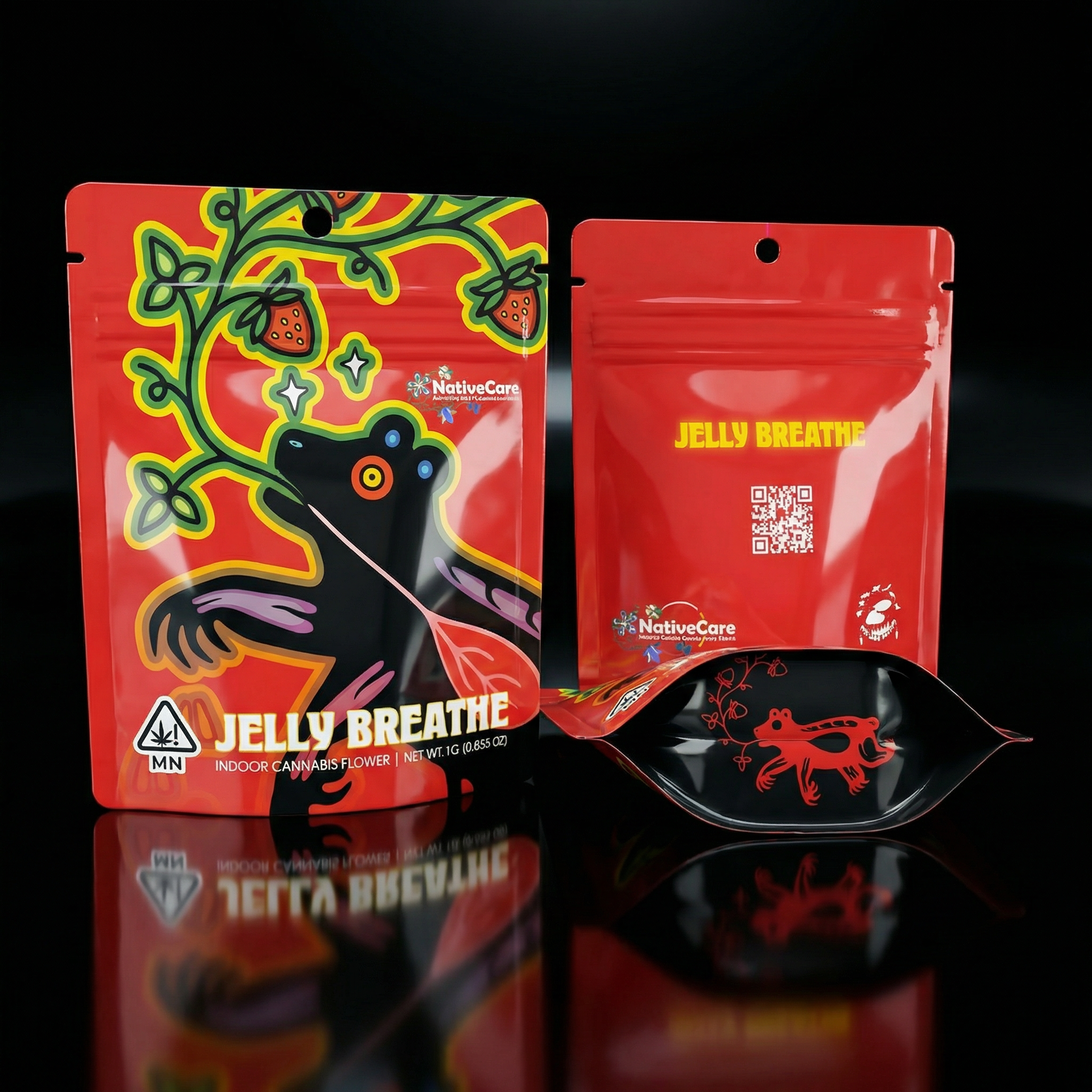 Black coffee bag with red, white, and black tribal patterns on a black background.